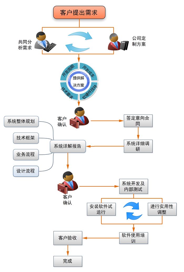 開 發過程將經歷獲取需求、需求分析、系統結構建立、軟件設計、代碼編寫、軟件測試等階段。 當軟件的后期測試完成后,通知業務需求人員驗收,驗收主要以業務 需求人員提供的原始資料及《軟件定制開發需求書》為依據,對軟件的各項功能進行全面的核查, 如無異議,驗收后簽署“驗收確認書”。項目組有義務對用戶提 供及時、有效、全面的培訓,并在項目實施過程中分重視對用戶方的技術轉移,并提前制訂有效可行的培訓計劃。